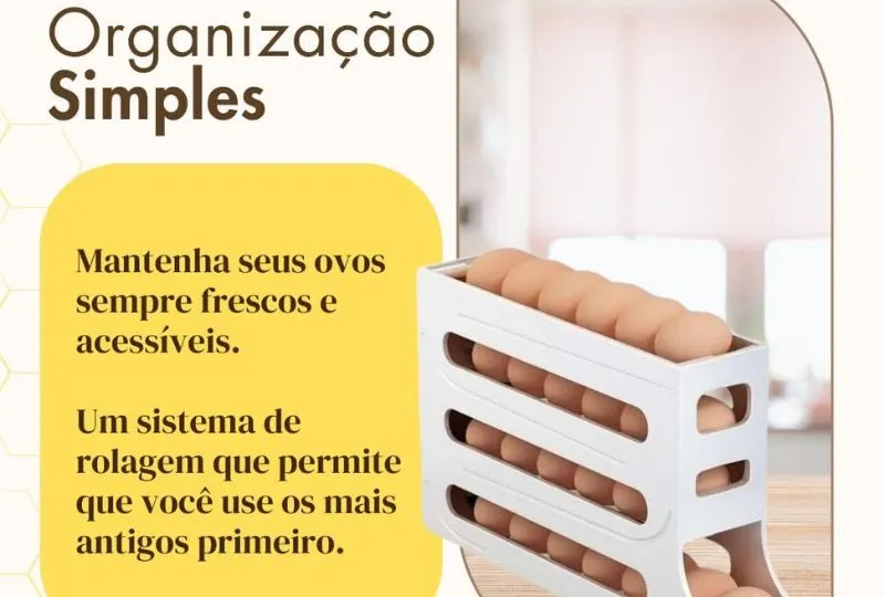 O porta-ovos organiza os ovos verticalmente ou em formatos compactos, permitindo armazenar mais produtos ao redor, maximizando o espaço disponível.